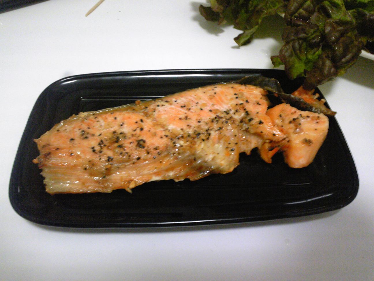 まず、鮭にオリーブオイル、ガーリック塩コショウの味付けをします。